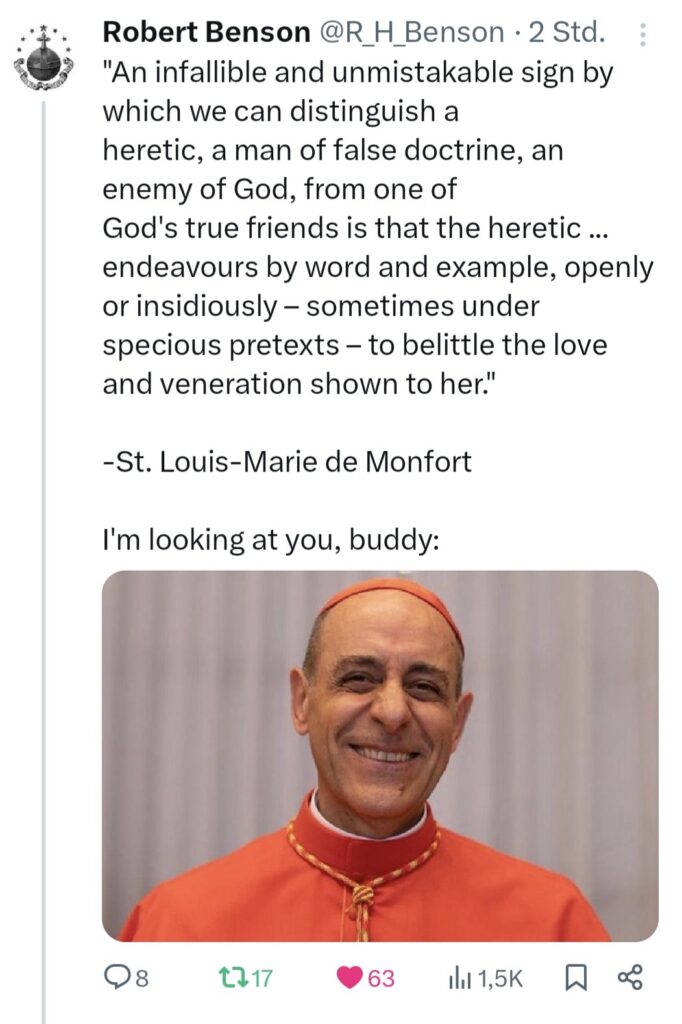 “An infallible and unmistakable sign by which we can distinguish a heretic, a man of false doctrine, an enemy of God, from one of God’s true friends is that the heretic … endeavours by word and example, openly or insidiously – sometimes under specious pretexts – to belittle the love and veneration shown to her (the Blessed Virgin Mary, Mother of God, Co-Redemptrix, Mediatrix of All Graces, and Queen of Heaven and Earth.)